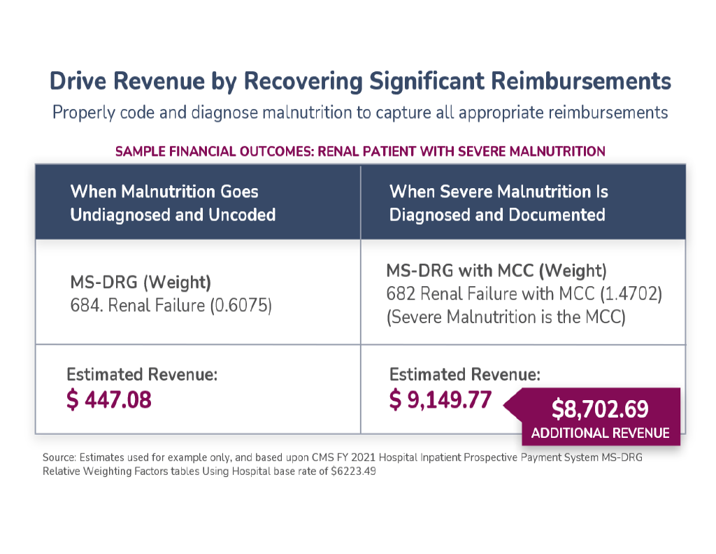 Here is an example of the financial impact of properly diagnosing, documenting, and coding malnutrition care for a patient.
